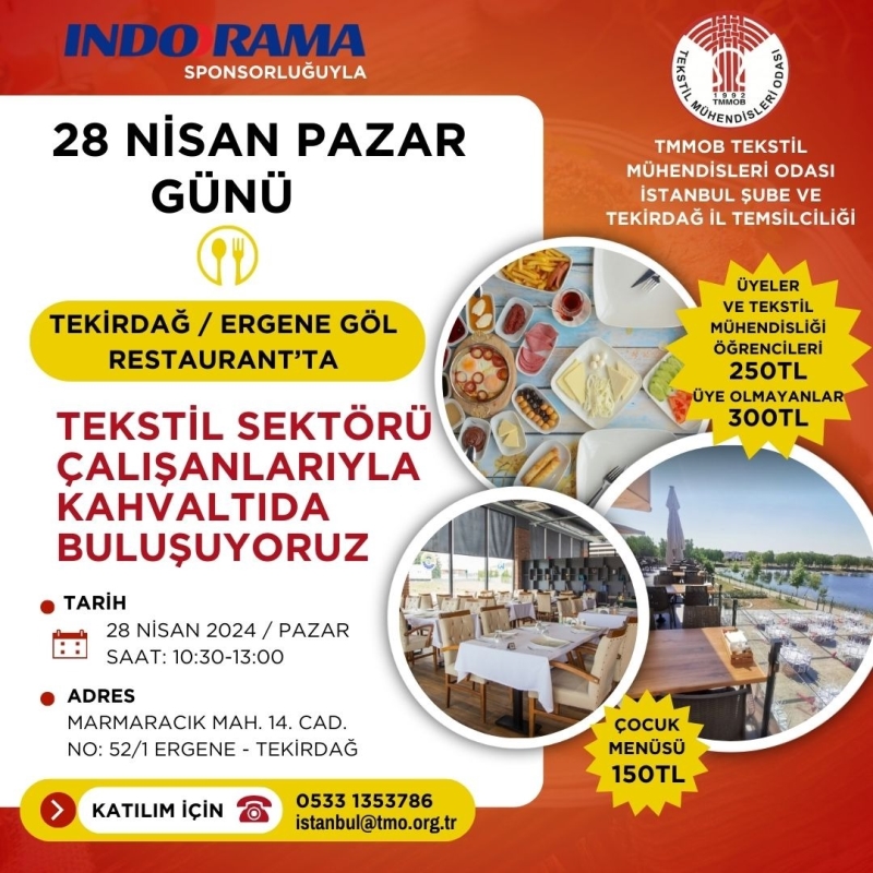 TMMOB Tekstil Mühendisleri Odası İstanbul Şube olarak, Trakya Bölgesinde yaşayan meslektaşlarımızı, üyelerimizi ve Tekstil Mühendisliği Bölümü öğrencilerini 28 Nisan 2024 Pazar günü Ergene Göl Restaurant’ta, İndorama İplik iş birliği ile gerçekleştireceğimiz “Kahvaltı Buluşmamıza” bekliyoruz.